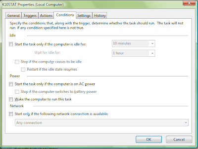 The program will load the settings from K10STAT.dat so make sure all the changes are overwritten to the file. When you launch K10STAT manually a new K10STAT.dat will be created in C:\Program Files\K10STAT which Task Scheduler WILL NOT LOAD. It will only load the K10STAT.dat in C:\Windows\System32 unless you change the "Start In" parameters to "C:\Program Files\K10STAT". If you do not specify “Start In” parameters, the file “K10stat.dat” will be created in C:\Windows\System32 (Default Administrator Path) as shown below.